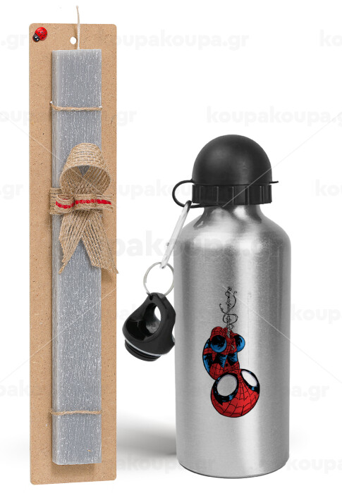 Spiderman upside down, Πασχαλινή Λαμπάδα με παγούρι μεταλλικό Ασημένιο αλουμινίου (500ml) & κερί αρωματικό πλακέ (30cm) (ΓΚΡΙ)