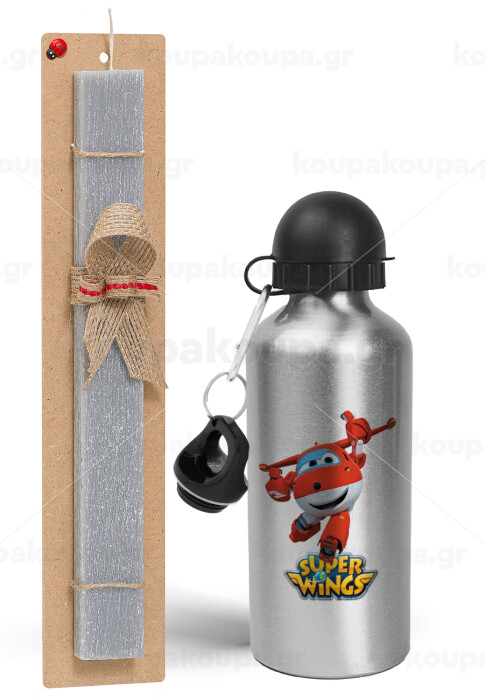 Super Wings, Πασχαλινή Λαμπάδα με παγούρι μεταλλικό Ασημένιο αλουμινίου (500ml) & κερί αρωματικό πλακέ (30cm) (ΓΚΡΙ)