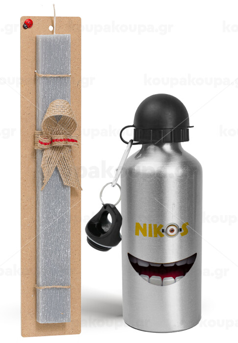 The minions, Πασχαλινή Λαμπάδα με παγούρι μεταλλικό Ασημένιο αλουμινίου (500ml) & κερί αρωματικό πλακέ (30cm) (ΓΚΡΙ)