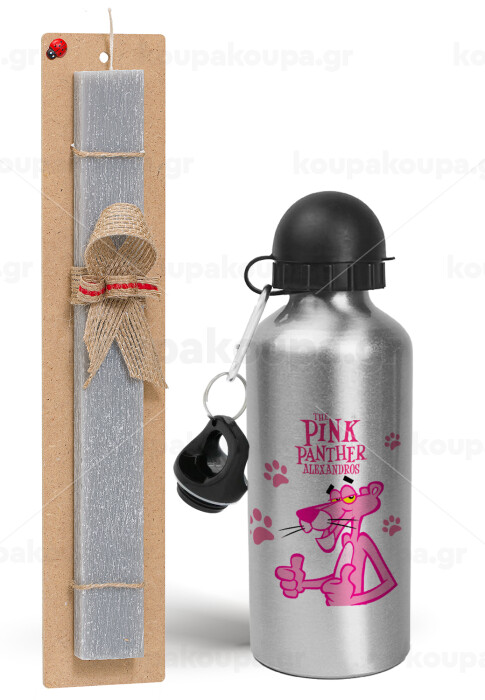 The pink panther, Πασχαλινή Λαμπάδα με παγούρι μεταλλικό Ασημένιο αλουμινίου (500ml) & κερί αρωματικό πλακέ (30cm) (ΓΚΡΙ)