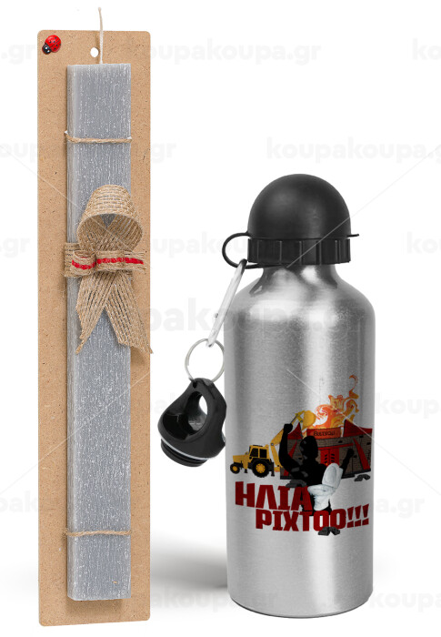 Ηλία ρίχτοοο!!!, Πασχαλινή Λαμπάδα με παγούρι μεταλλικό Ασημένιο αλουμινίου (500ml) & κερί αρωματικό πλακέ (30cm) (ΓΚΡΙ)