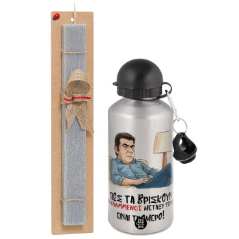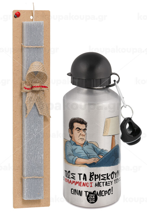 ΠΩΣ ΤΑ ΒΡΙΣΚΟΥΝ ΟΙ ΒΛΑ....ΝΟΙ ΜΕΤΑΞΥ ΤΟΥΣ, ΕΙΝΑΙ ΤΡΟΜΕΡΟ!!!, Πασχαλινή Λαμπάδα με παγούρι μεταλλικό Ασημένιο αλουμινίου (500ml) & κερί αρωματικό πλακέ (30cm) (ΓΚΡΙ)