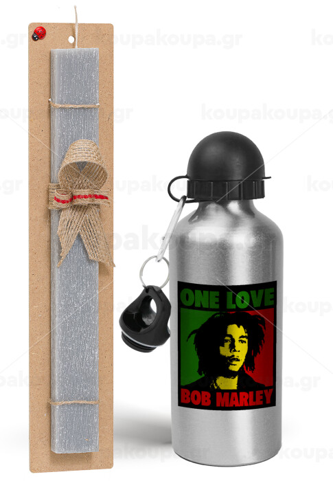 Bob marley, one love, Πασχαλινή Λαμπάδα με παγούρι μεταλλικό Ασημένιο αλουμινίου (500ml) & κερί αρωματικό πλακέ (30cm) (ΓΚΡΙ)