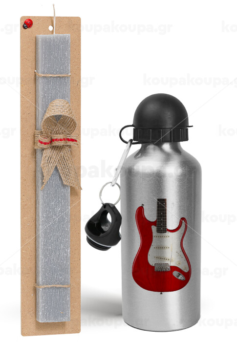 Guitar stratocaster, Πασχαλινή Λαμπάδα με παγούρι μεταλλικό Ασημένιο αλουμινίου (500ml) & κερί αρωματικό πλακέ (30cm) (ΓΚΡΙ)