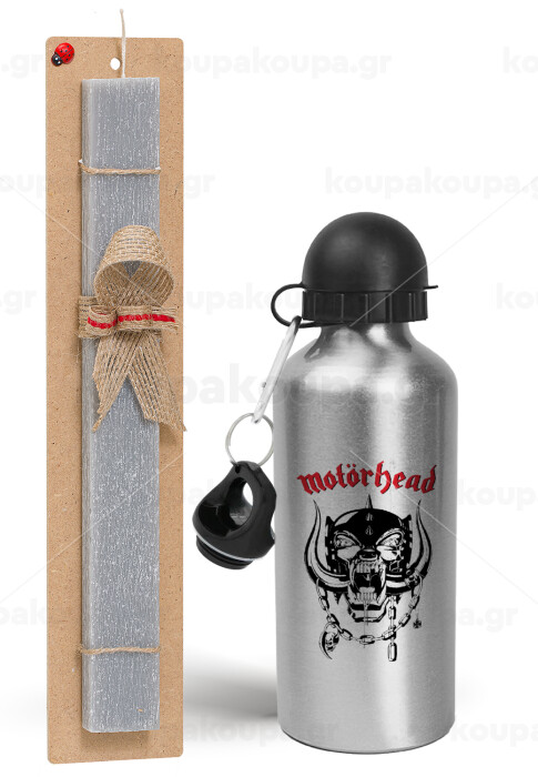 motorhead, Πασχαλινή Λαμπάδα με παγούρι μεταλλικό Ασημένιο αλουμινίου (500ml) & κερί αρωματικό πλακέ (30cm) (ΓΚΡΙ)