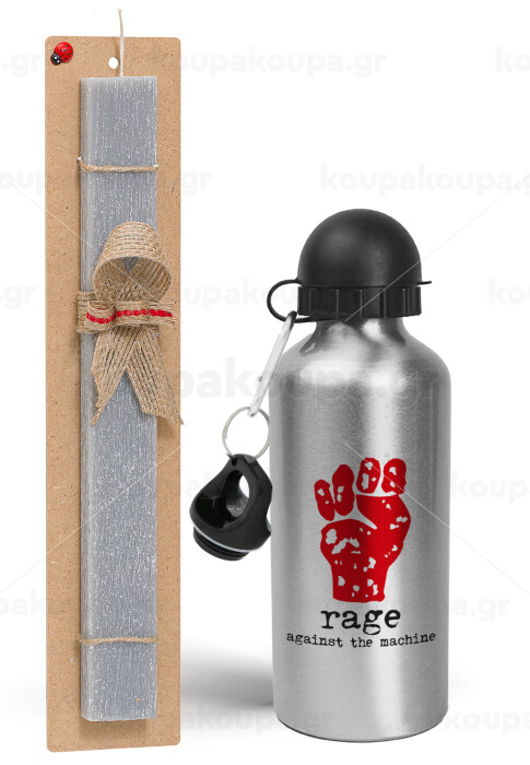 Rage against the machine, Πασχαλινή Λαμπάδα με παγούρι μεταλλικό Ασημένιο αλουμινίου (500ml) & κερί αρωματικό πλακέ (30cm) (ΓΚΡΙ)