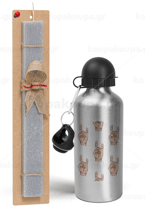 Rock hands, Πασχαλινή Λαμπάδα με παγούρι μεταλλικό Ασημένιο αλουμινίου (500ml) & κερί αρωματικό πλακέ (30cm) (ΓΚΡΙ)
