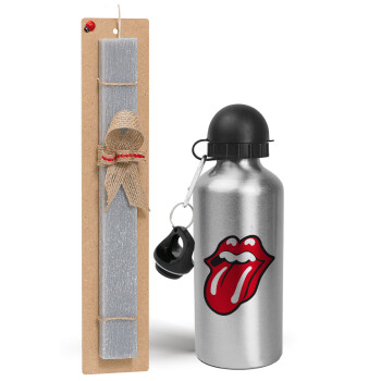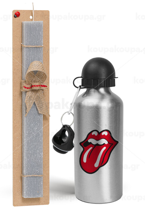 Rolling Stones Kiss, Πασχαλινή Λαμπάδα με παγούρι μεταλλικό Ασημένιο αλουμινίου (500ml) & κερί αρωματικό πλακέ (30cm) (ΓΚΡΙ)