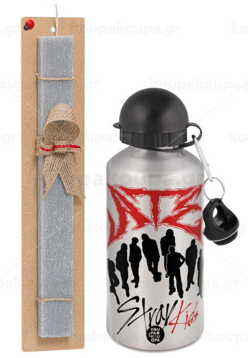 Stray Kids Boy band, Πασχαλινή Λαμπάδα με παγούρι μεταλλικό Ασημένιο αλουμινίου (500ml) & κερί αρωματικό πλακέ (30cm) (ΓΚΡΙ)