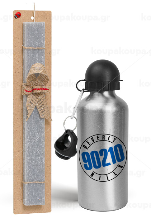 Beverly Hills, 90210, Πασχαλινή Λαμπάδα με παγούρι μεταλλικό Ασημένιο αλουμινίου (500ml) & κερί αρωματικό πλακέ (30cm) (ΓΚΡΙ)