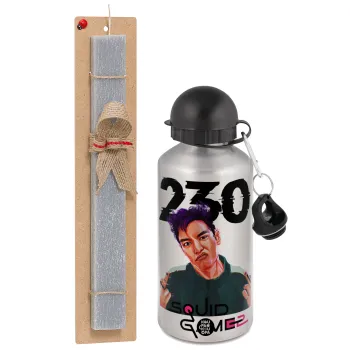 Squid game 2, Thanos 230, Πασχαλινή Λαμπάδα με παγούρι μεταλλικό Ασημένιο αλουμινίου (500ml) & κερί αρωματικό πλακέ (30cm) (ΓΚΡΙ)