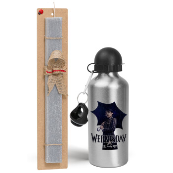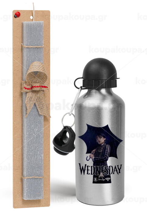 Wednesday rain, Πασχαλινή Λαμπάδα με παγούρι μεταλλικό Ασημένιο αλουμινίου (500ml) & κερί αρωματικό πλακέ (30cm) (ΓΚΡΙ)