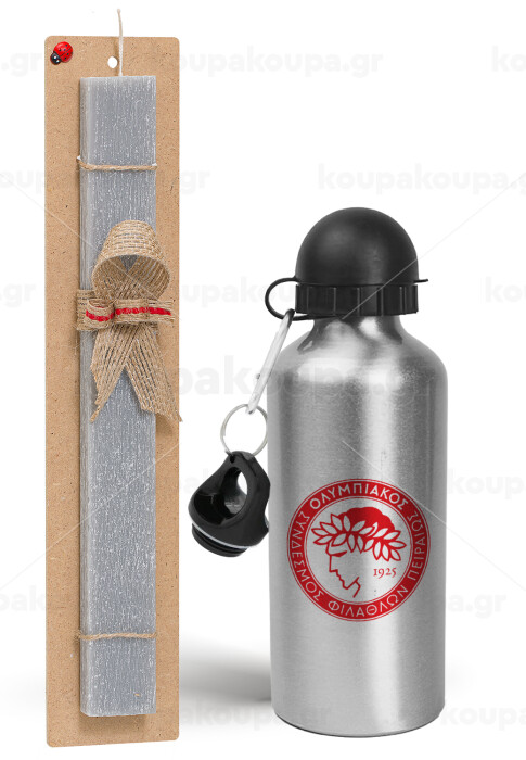 Ολυμπιακός, Πασχαλινή Λαμπάδα με παγούρι μεταλλικό Ασημένιο αλουμινίου (500ml) & κερί αρωματικό πλακέ (30cm) (ΓΚΡΙ)