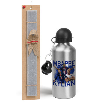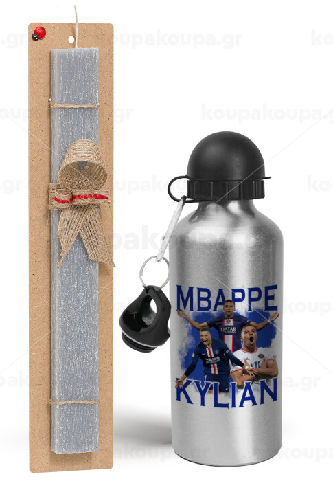 Kylian mbappe, Πασχαλινή Λαμπάδα με παγούρι μεταλλικό Ασημένιο αλουμινίου (500ml) & κερί αρωματικό πλακέ (30cm) (ΓΚΡΙ)