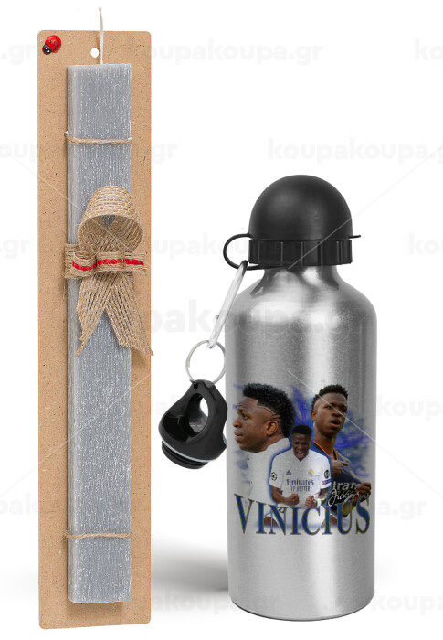 Vinicius Junior, Πασχαλινή Λαμπάδα με παγούρι μεταλλικό Ασημένιο αλουμινίου (500ml) & κερί αρωματικό πλακέ (30cm) (ΓΚΡΙ)