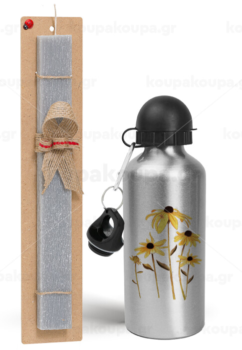 Daisies flower, Πασχαλινή Λαμπάδα με παγούρι μεταλλικό Ασημένιο αλουμινίου (500ml) & κερί αρωματικό πλακέ (30cm) (ΓΚΡΙ)
