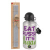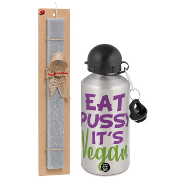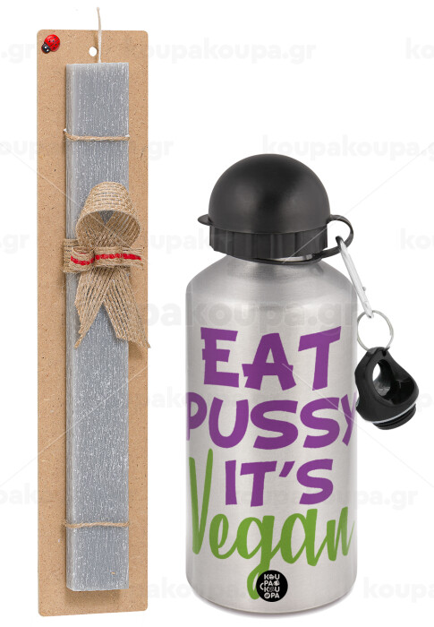 EAT pussy it's vegan, Πασχαλινή Λαμπάδα με παγούρι μεταλλικό Ασημένιο αλουμινίου (500ml) & κερί αρωματικό πλακέ (30cm) (ΓΚΡΙ)