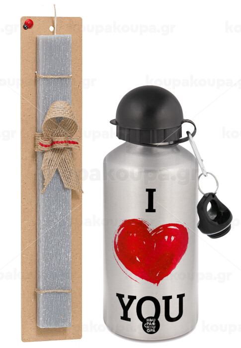 I Love You, Πασχαλινή Λαμπάδα με παγούρι μεταλλικό Ασημένιο αλουμινίου (500ml) & κερί αρωματικό πλακέ (30cm) (ΓΚΡΙ)