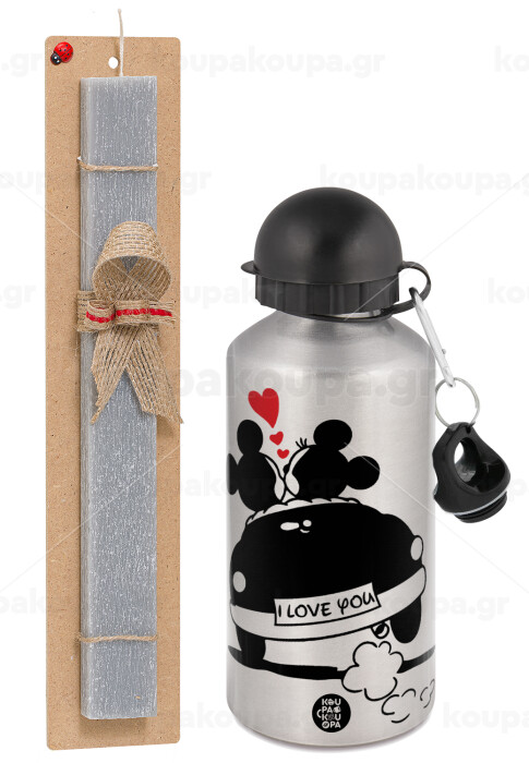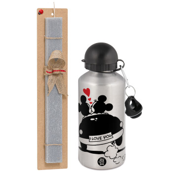 Love Car, Πασχαλινή Λαμπάδα με παγούρι μεταλλικό Ασημένιο αλουμινίου (500ml) & κερί αρωματικό πλακέ (30cm) (ΓΚΡΙ)
