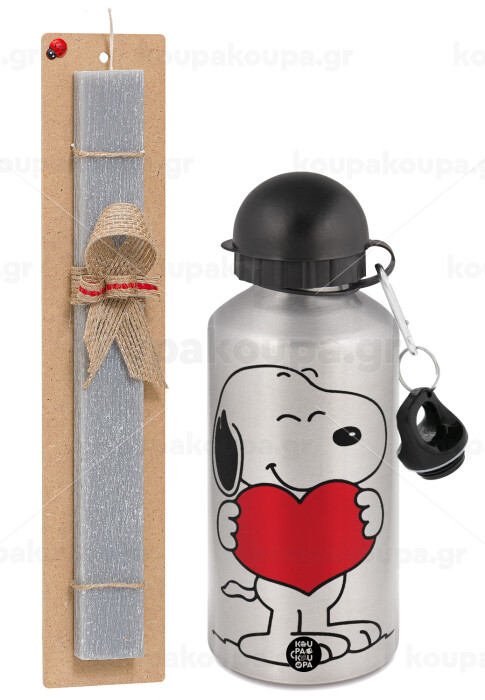 Snoopy takemy heart, Πασχαλινή Λαμπάδα με παγούρι μεταλλικό Ασημένιο αλουμινίου (500ml) & κερί αρωματικό πλακέ (30cm) (ΓΚΡΙ)
