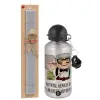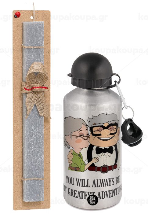 UP, YOU WILL ALWAYS BE MY GREATEST ADVENTURE, Πασχαλινή Λαμπάδα με παγούρι μεταλλικό Ασημένιο αλουμινίου (500ml) & κερί αρωματικό πλακέ (30cm) (ΓΚΡΙ)