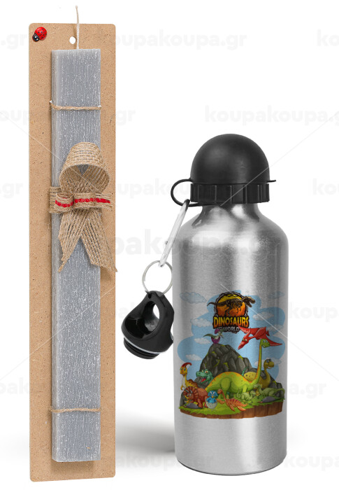 Dinosaur's world, Πασχαλινή Λαμπάδα με παγούρι μεταλλικό Ασημένιο αλουμινίου (500ml) & κερί αρωματικό πλακέ (30cm) (ΓΚΡΙ)