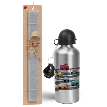 Hand drawn childish set with cars, Πασχαλινή Λαμπάδα με παγούρι μεταλλικό Ασημένιο αλουμινίου (500ml) & κερί αρωματικό πλακέ (30cm) (ΓΚΡΙ)