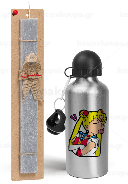 Sailor Moon, Πασχαλινή Λαμπάδα με παγούρι μεταλλικό Ασημένιο αλουμινίου (500ml) & κερί αρωματικό πλακέ (30cm) (ΓΚΡΙ)