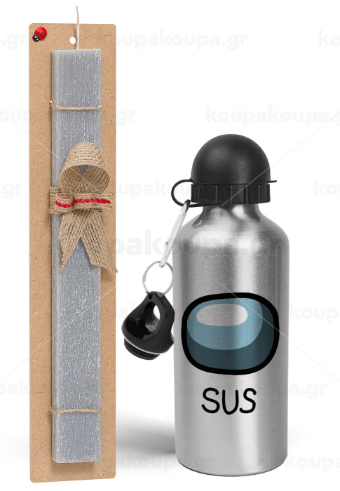 Among US SUS!!!, Πασχαλινή Λαμπάδα με παγούρι μεταλλικό Ασημένιο αλουμινίου (500ml) & κερί αρωματικό πλακέ (30cm) (ΓΚΡΙ)