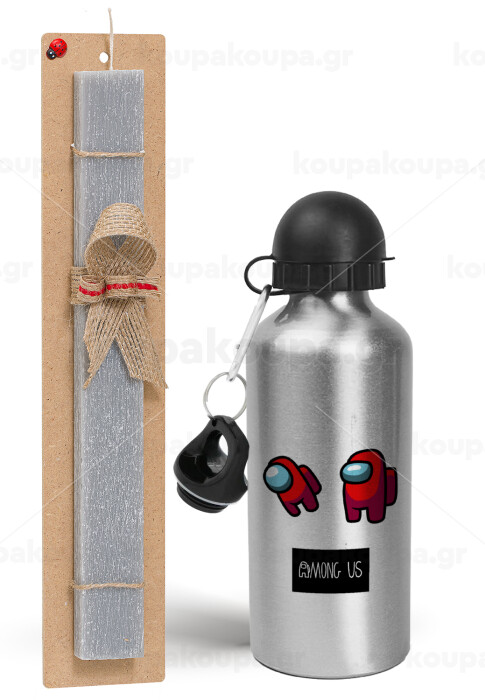 Among US, Πασχαλινή Λαμπάδα με παγούρι μεταλλικό Ασημένιο αλουμινίου (500ml) & κερί αρωματικό πλακέ (30cm) (ΓΚΡΙ)