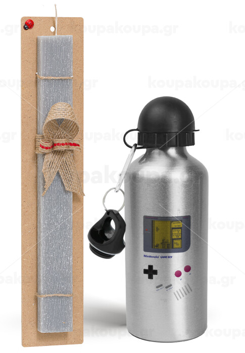 Gameboy, Πασχαλινή Λαμπάδα με παγούρι μεταλλικό Ασημένιο αλουμινίου (500ml) & κερί αρωματικό πλακέ (30cm) (ΓΚΡΙ)