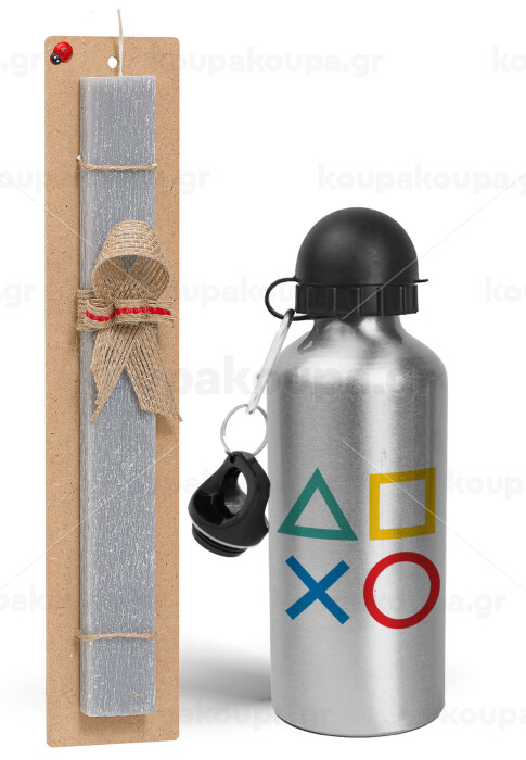 Gaming Symbols, Πασχαλινή Λαμπάδα με παγούρι μεταλλικό Ασημένιο αλουμινίου (500ml) & κερί αρωματικό πλακέ (30cm) (ΓΚΡΙ)