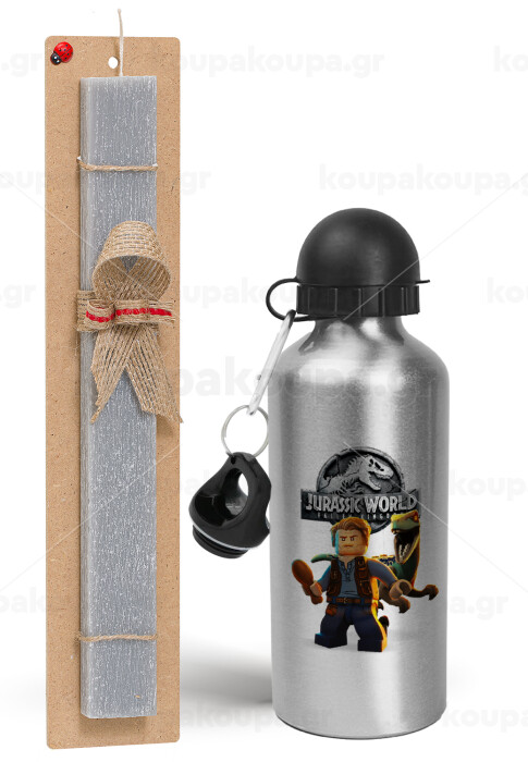 Jurassic world, Πασχαλινή Λαμπάδα με παγούρι μεταλλικό Ασημένιο αλουμινίου (500ml) & κερί αρωματικό πλακέ (30cm) (ΓΚΡΙ)