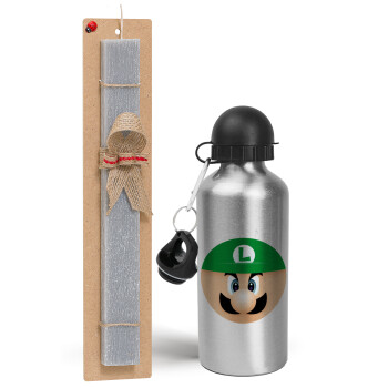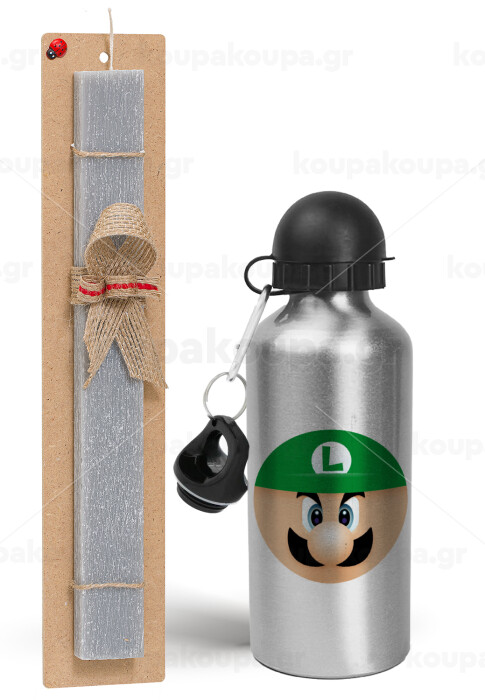 Luigi flat, Πασχαλινή Λαμπάδα με παγούρι μεταλλικό Ασημένιο αλουμινίου (500ml) & κερί αρωματικό πλακέ (30cm) (ΓΚΡΙ)
