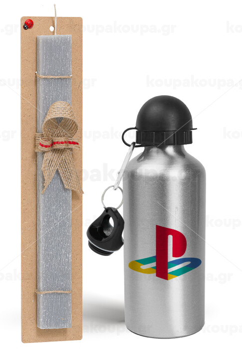 Playstation, Πασχαλινή Λαμπάδα με παγούρι μεταλλικό Ασημένιο αλουμινίου (500ml) & κερί αρωματικό πλακέ (30cm) (ΓΚΡΙ)