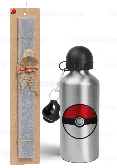 Pokemon ball, Πασχαλινή Λαμπάδα με παγούρι μεταλλικό Ασημένιο αλουμινίου (500ml) & κερί αρωματικό πλακέ (30cm) (ΓΚΡΙ)