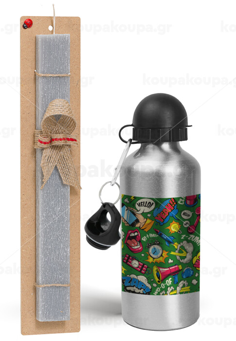 Pop art colorful seamless, Πασχαλινή Λαμπάδα με παγούρι μεταλλικό Ασημένιο αλουμινίου (500ml) & κερί αρωματικό πλακέ (30cm) (ΓΚΡΙ)