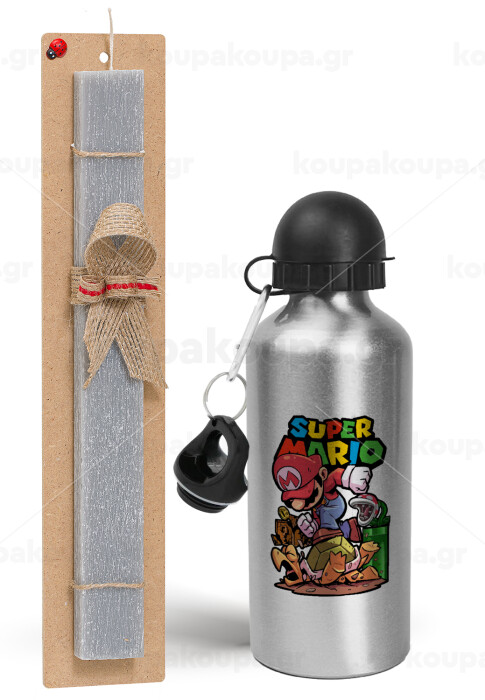 Super mario Jump, Πασχαλινή Λαμπάδα με παγούρι μεταλλικό Ασημένιο αλουμινίου (500ml) & κερί αρωματικό πλακέ (30cm) (ΓΚΡΙ)