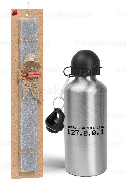 there's no place like 127.0.0.1, Πασχαλινή Λαμπάδα με παγούρι μεταλλικό Ασημένιο αλουμινίου (500ml) & κερί αρωματικό πλακέ (30cm) (ΓΚΡΙ)