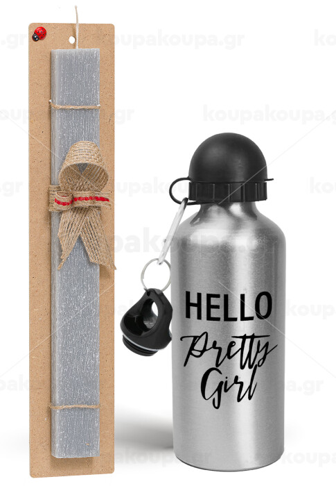 Hello pretty girl, Πασχαλινή Λαμπάδα με παγούρι μεταλλικό Ασημένιο αλουμινίου (500ml) & κερί αρωματικό πλακέ (30cm) (ΓΚΡΙ)
