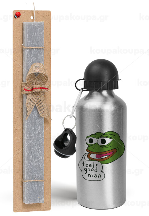 Pepe the frog, Πασχαλινή Λαμπάδα με παγούρι μεταλλικό Ασημένιο αλουμινίου (500ml) & κερί αρωματικό πλακέ (30cm) (ΓΚΡΙ)