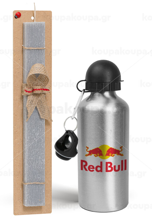 Redbull, Πασχαλινή Λαμπάδα με παγούρι μεταλλικό Ασημένιο αλουμινίου (500ml) & κερί αρωματικό πλακέ (30cm) (ΓΚΡΙ)