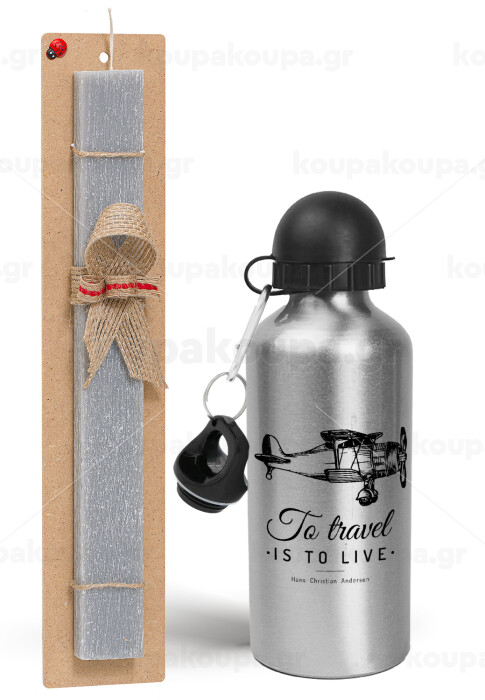 To travel is to live, Πασχαλινή Λαμπάδα με παγούρι μεταλλικό Ασημένιο αλουμινίου (500ml) & κερί αρωματικό πλακέ (30cm) (ΓΚΡΙ)