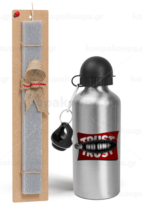 Trust no one... (zipper), Πασχαλινή Λαμπάδα με παγούρι μεταλλικό Ασημένιο αλουμινίου (500ml) & κερί αρωματικό πλακέ (30cm) (ΓΚΡΙ)