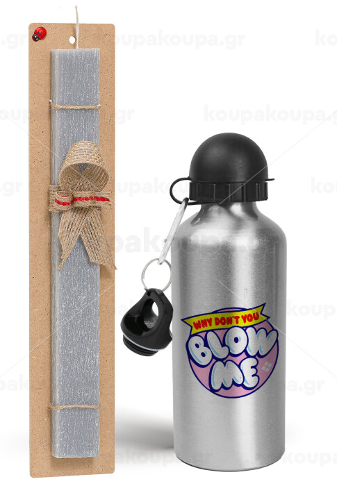 Why Don't You Blow Me Funny, Πασχαλινή Λαμπάδα με παγούρι μεταλλικό Ασημένιο αλουμινίου (500ml) & κερί αρωματικό πλακέ (30cm) (ΓΚΡΙ)