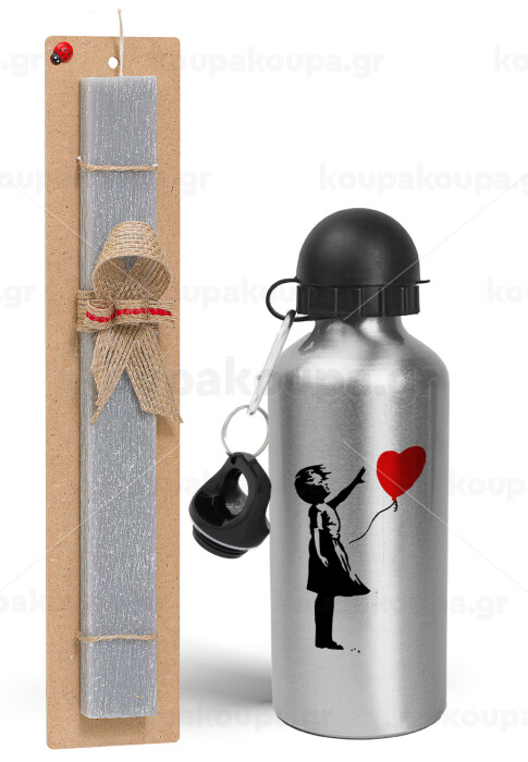 Banksy (Hope), Πασχαλινή Λαμπάδα με παγούρι μεταλλικό Ασημένιο αλουμινίου (500ml) & κερί αρωματικό πλακέ (30cm) (ΓΚΡΙ)