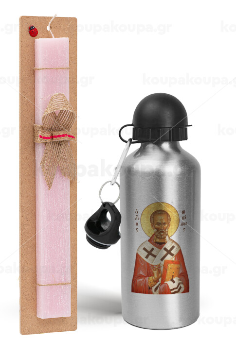 Άγιος Νικόλαος, Πασχαλινή Λαμπάδα με παγούρι μεταλλικό Ασημένιο αλουμινίου (500ml) & κερί αρωματικό πλακέ (30cm) (ΡΟΖ)