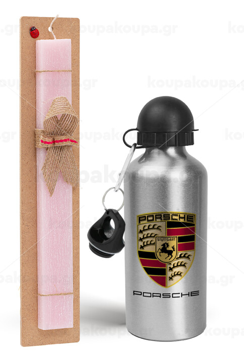 Porsche, Πασχαλινή Λαμπάδα με παγούρι μεταλλικό Ασημένιο αλουμινίου (500ml) & κερί αρωματικό πλακέ (30cm) (ΡΟΖ)
