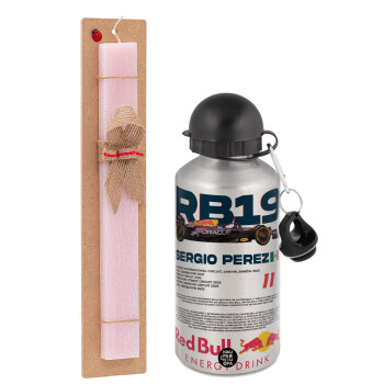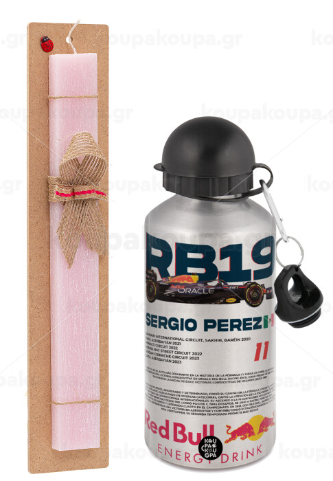 Redbull Sergio Perezi, Πασχαλινή Λαμπάδα με παγούρι μεταλλικό Ασημένιο αλουμινίου (500ml) & κερί αρωματικό πλακέ (30cm) (ΡΟΖ)