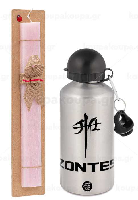ZONTES, Πασχαλινή Λαμπάδα με παγούρι μεταλλικό Ασημένιο αλουμινίου (500ml) & κερί αρωματικό πλακέ (30cm) (ΡΟΖ)